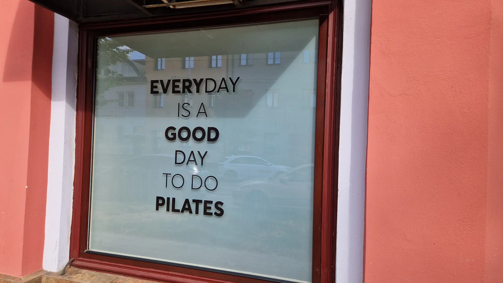 Instalace privátní fólie s řezanou grafikou pro sportovní centrum. Zákazník si vybral vysoce zrcadlovou privátní variantu fólie primárně k zabránění přímým pohledům z venku do interiéru, aniž by došlo k vážnému omezení světlosti.